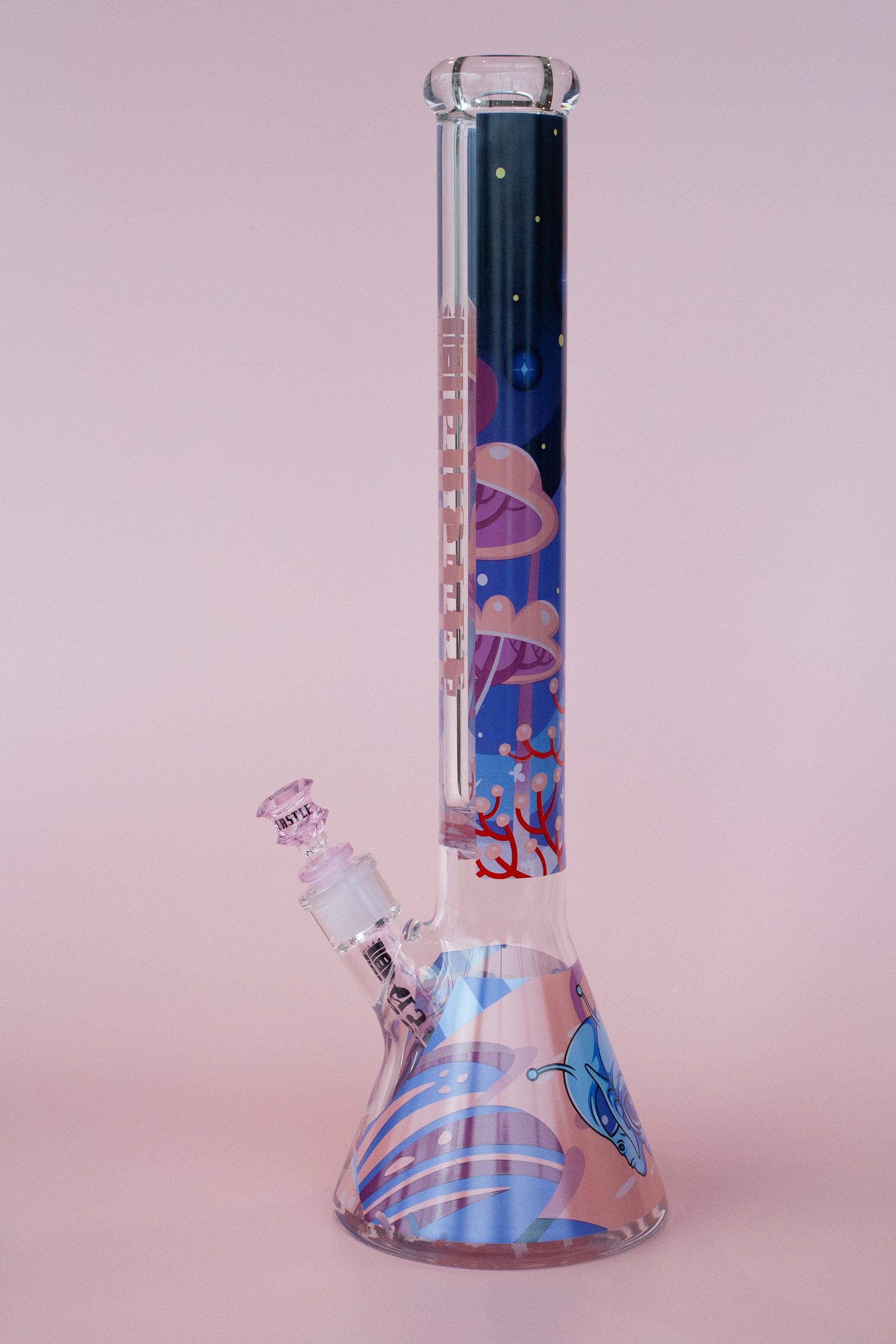 Looking for a bong that is both elegant and durable? Look no further than our Alien beaker! Crafted from high-quality borosilicate glass, this bong boasts a sturdy 12mm thick base and a wide 5-inch diameter. The decal design on the glass is expertly bonded, ensuring that it won't easily rub off over time. Plus, the decal features a convenient window below the downstem joint so you can easily monitor the cleanliness of your piece.