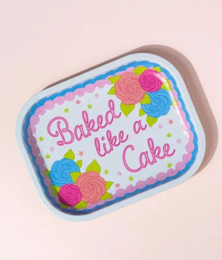 This mini sized tray features a realistic cake artwork, with a kitschy nod to getting high
