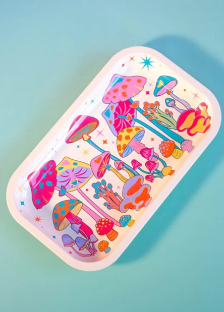 Large rolling tray featuring our colorful mushroom print, full of multi-colored fungi