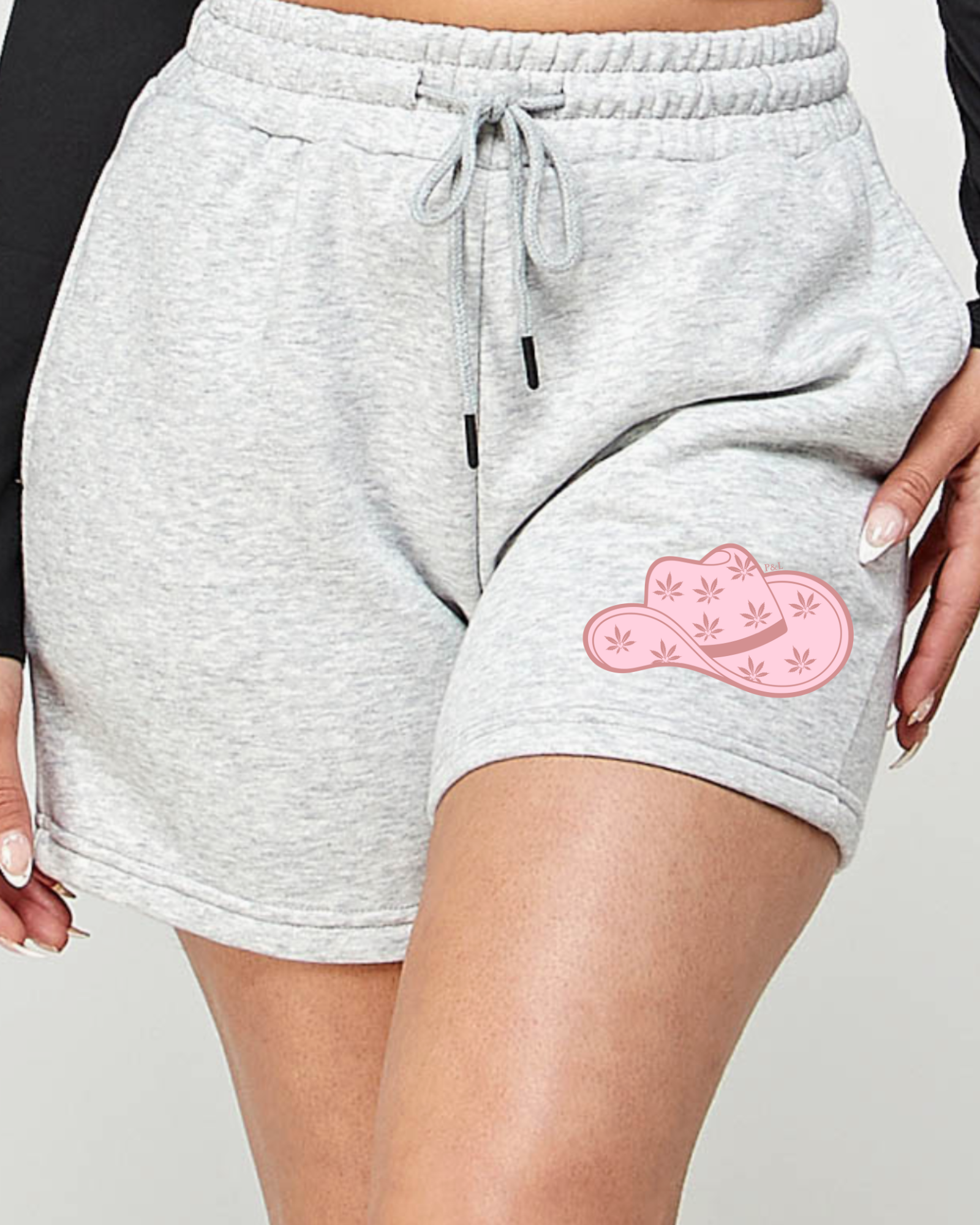 High waisted sweat shorts with elastic tie waist. On the thigh, a pink cowgirl hat with cannabis leaf pattern. Riding High!