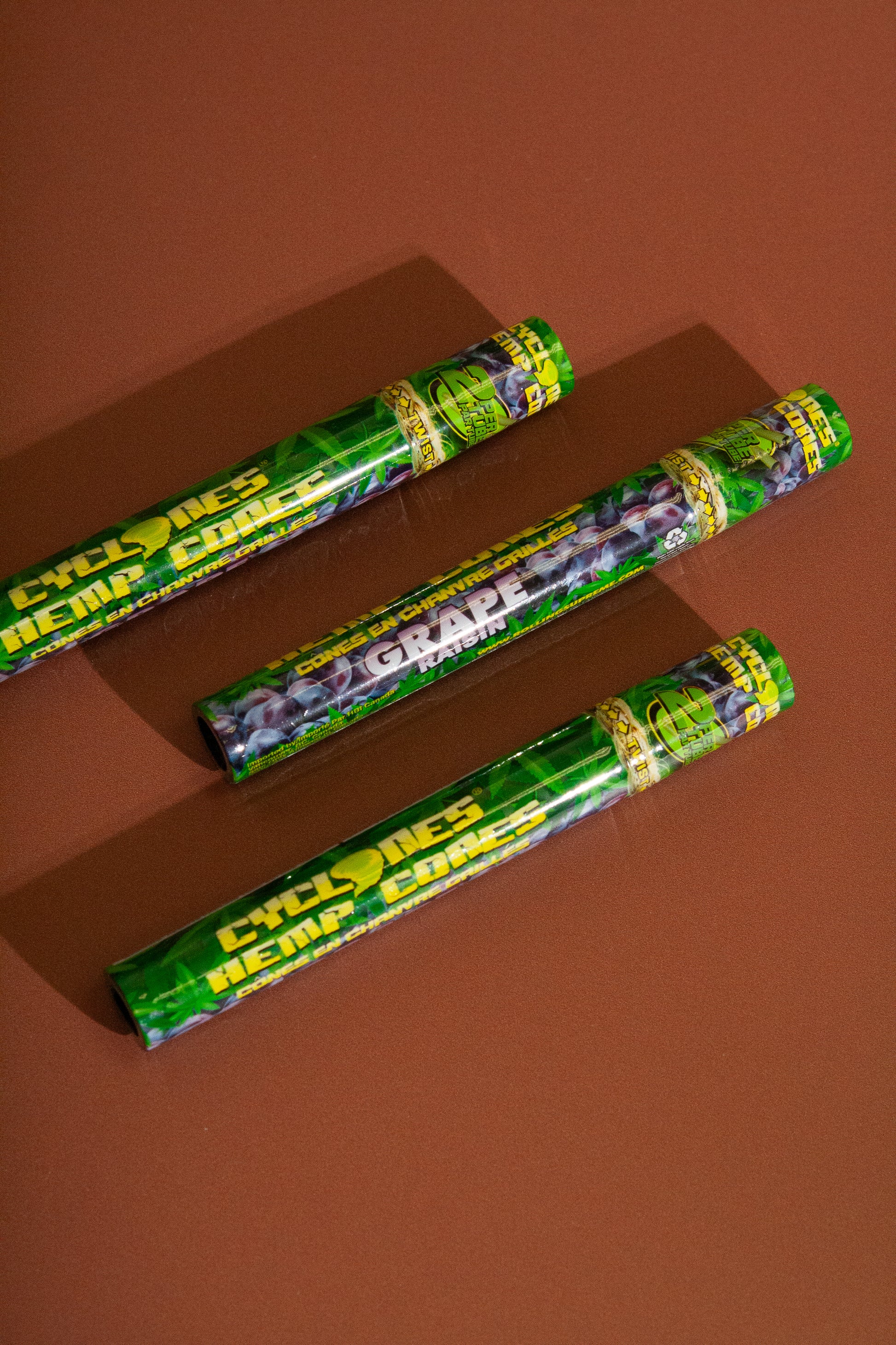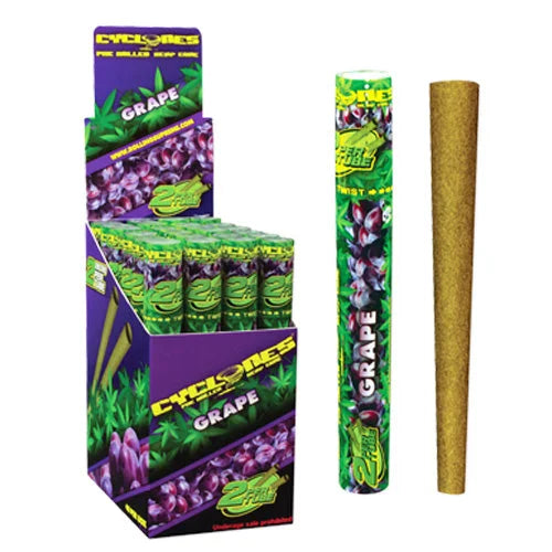 Grape Cyclones Hemp Cones are made with natural toasted hemp and packed with flavour! There is no tobacco and each cone comes with a built-in cardboard tip.