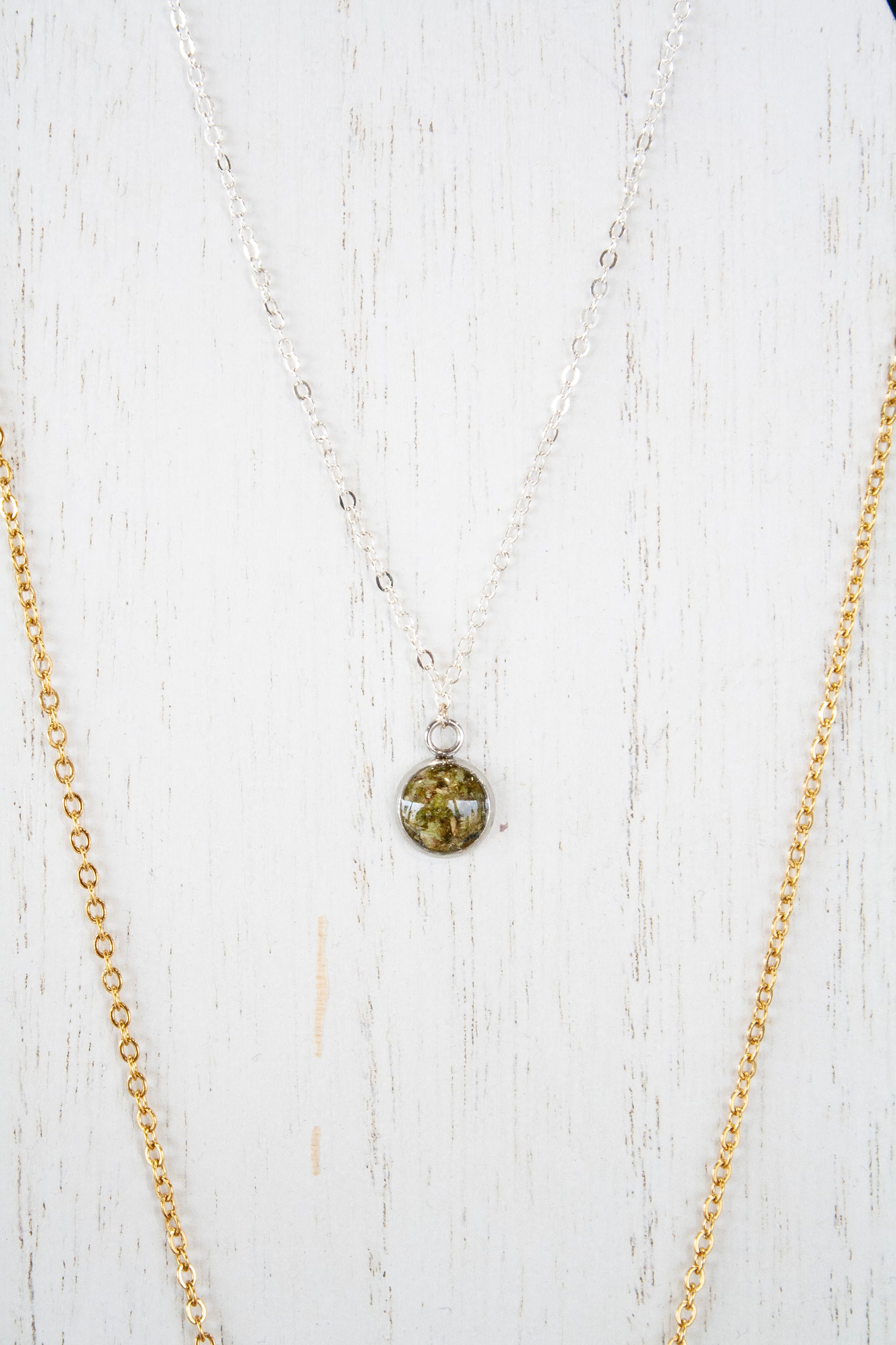 10mm round pendant with 18k gold fleck and ground Bubba Kush. Stamped sterling silver 18" chain. Handmade in Pembroke, Ontario by Moody Mays.
