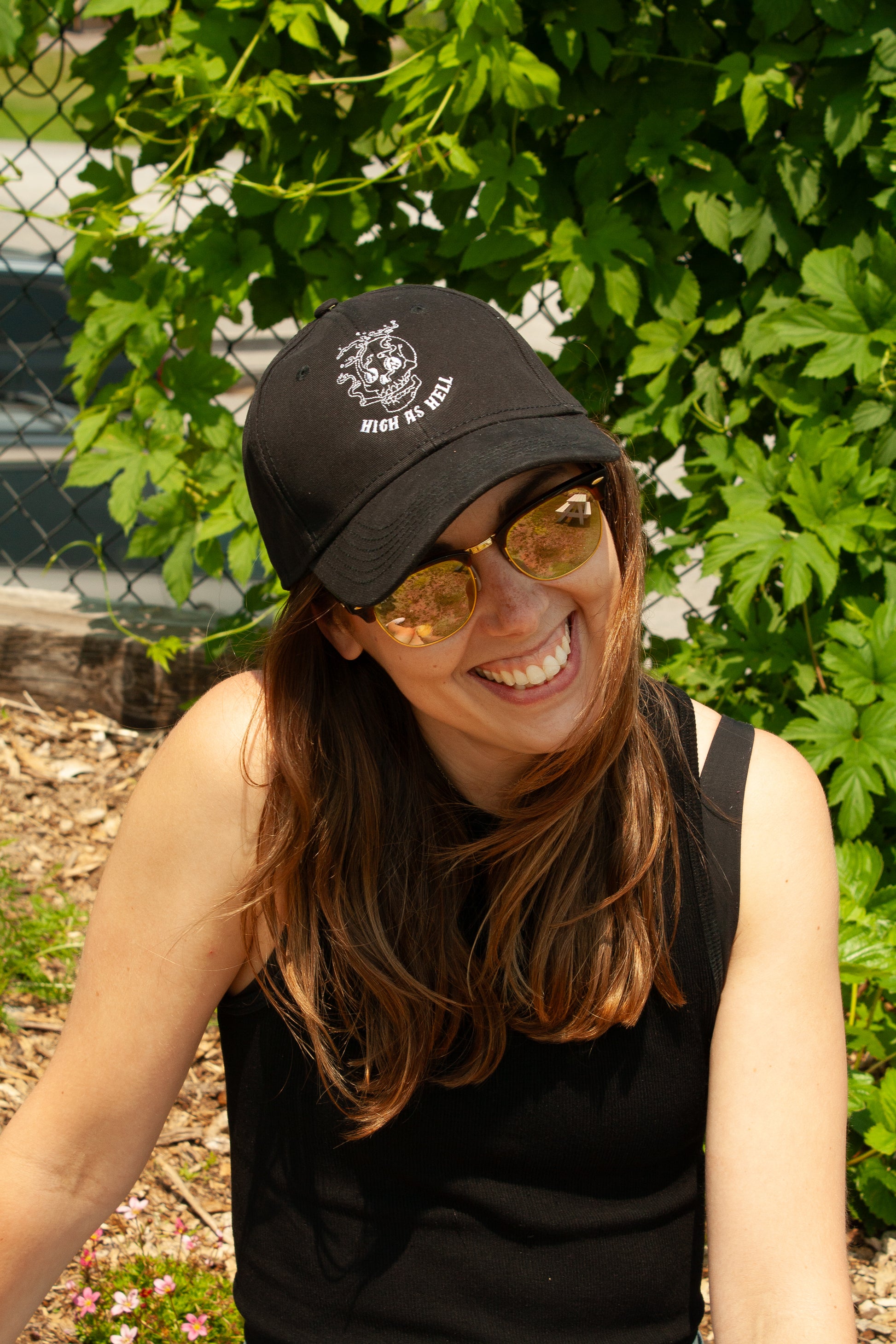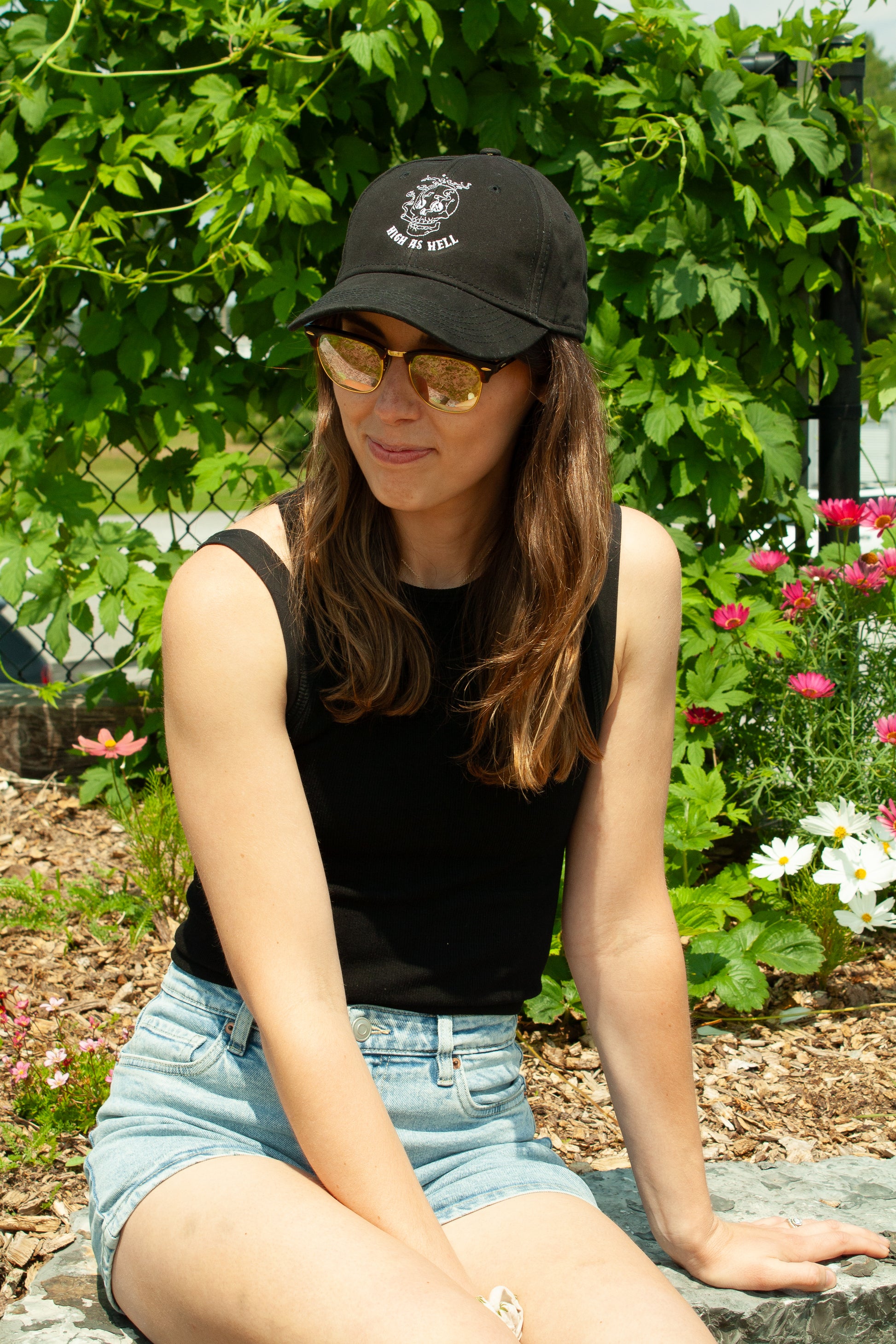 A classic black dad style cap. Embroidered on the front you'll find a joint smoking skull, "High as Hell." Branded embroidery on the back.