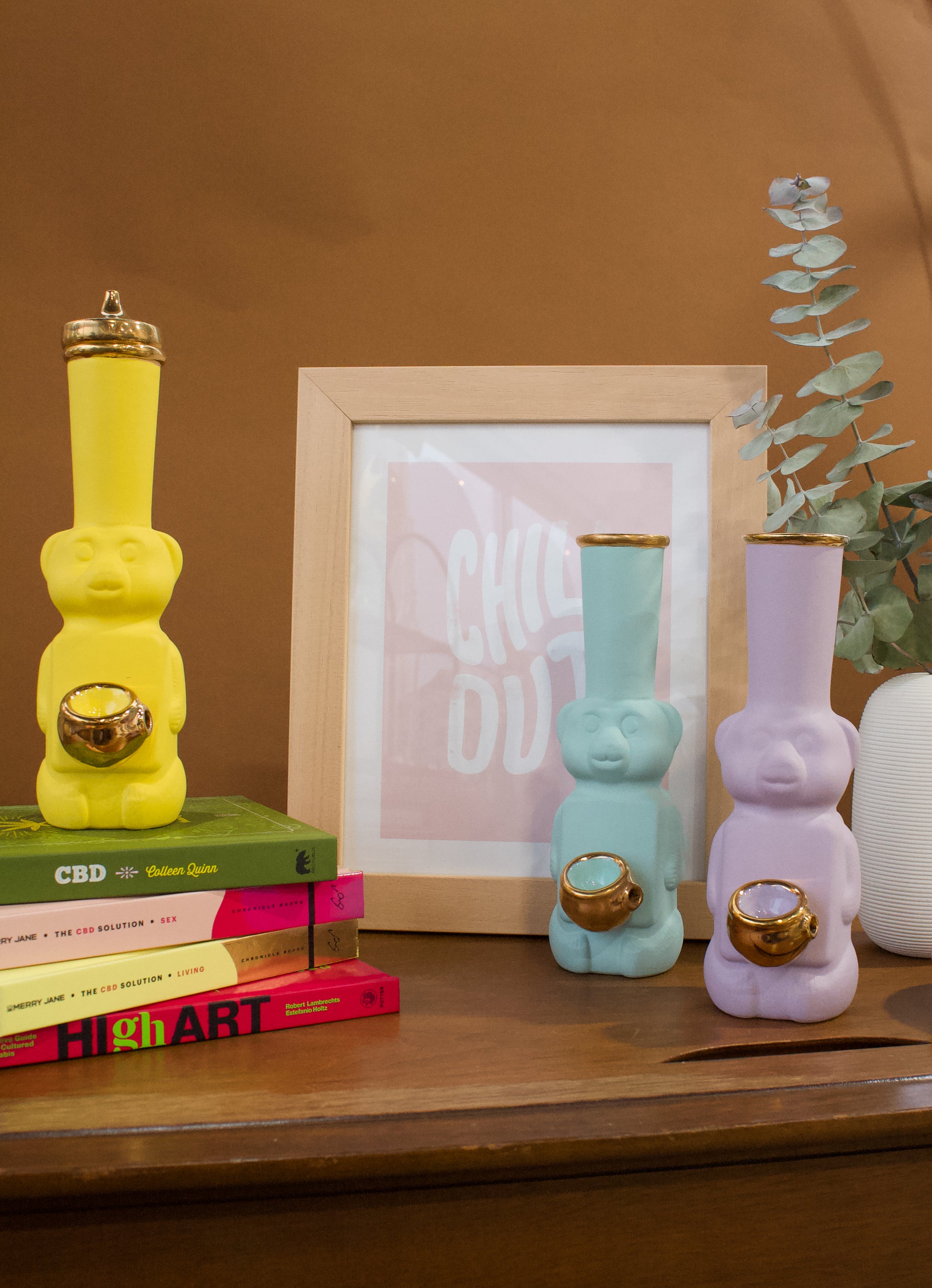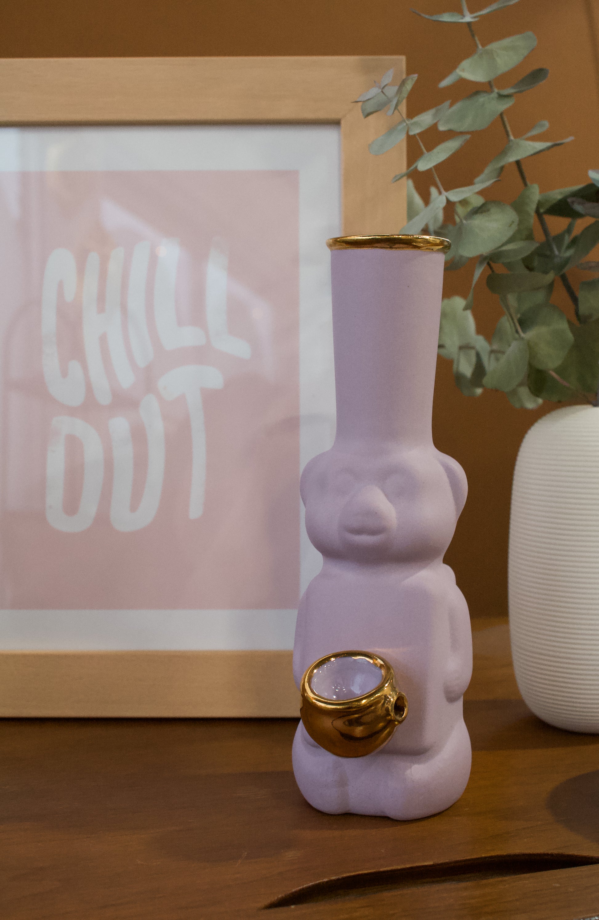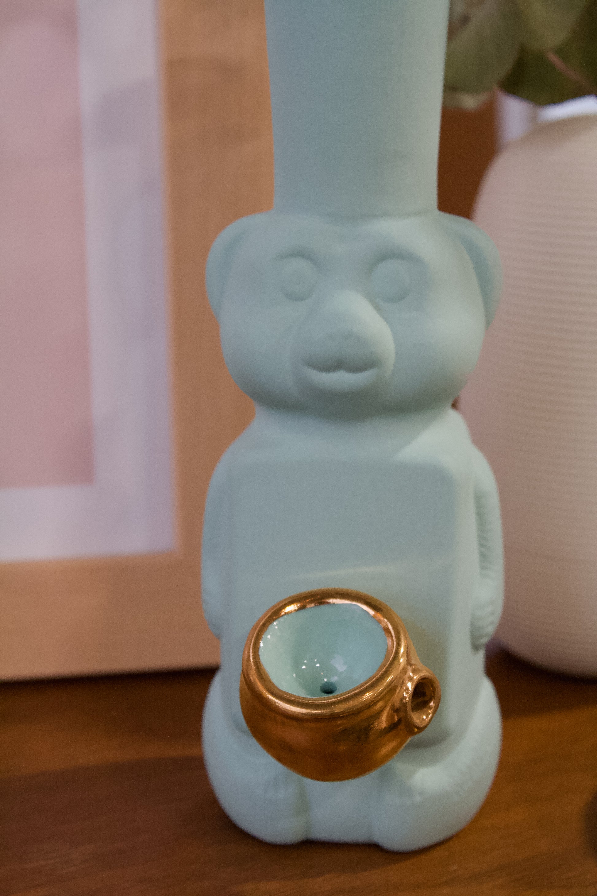 Bringing back old school memories, this bubbler is inspired by the once recycled honey bear. It can fit in with any room decor, with a gold lid that’s discrete and stylish. Finished in 22k gold.