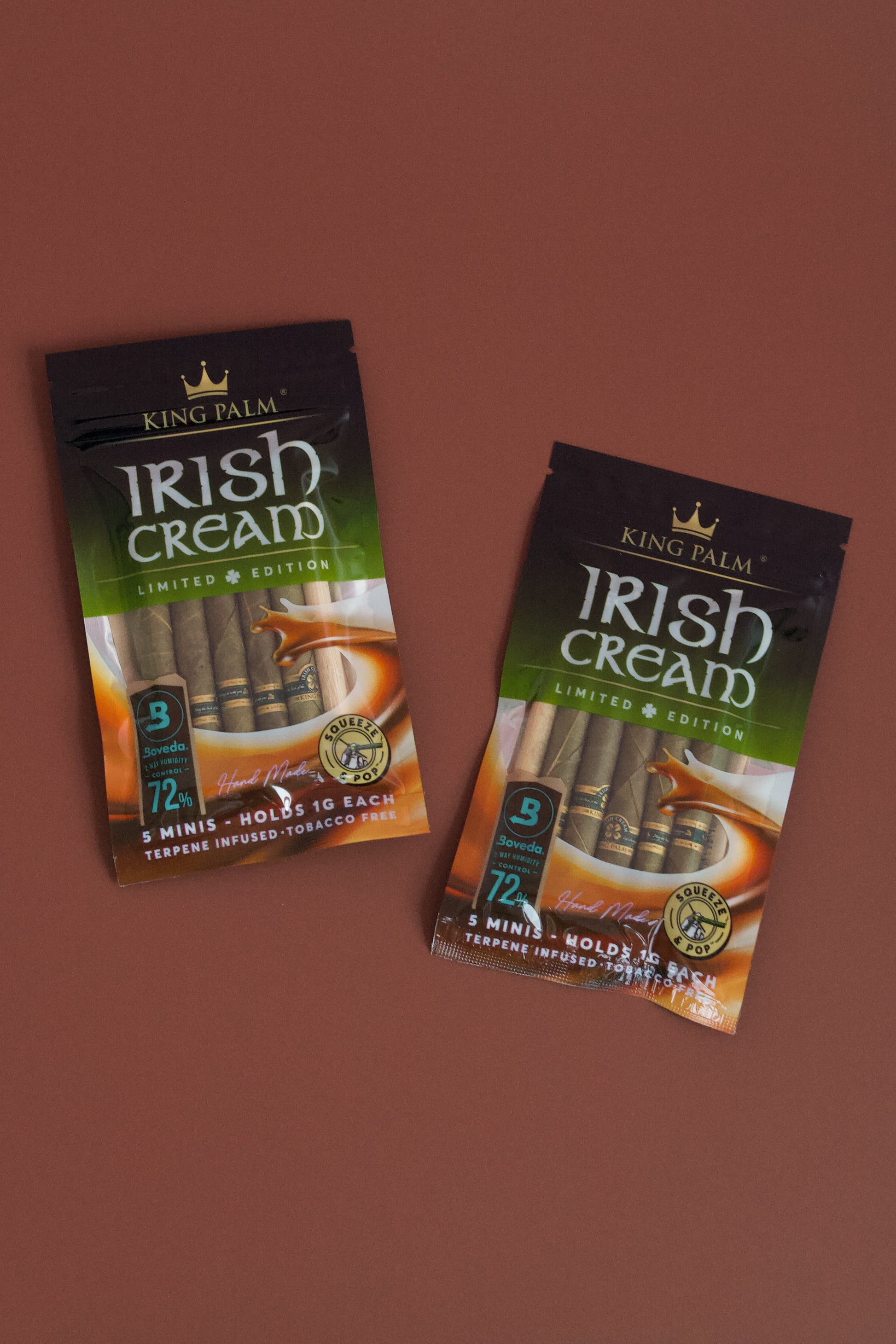 King Palm flavored Mini rolls hold up to 1g of flower and are the ideal product for any customer looking for a tasty, tobacco-free wrap option! Each pouch includes five rolls with flavor-infused filter tips plus a packing stick for precise preparation. You have complete control over the flavor experience! A flavor pearl sits inside each filter, and you squeeze the filter until you feel a pop that activates the flavor. If the pearl is not popped, it will taste just like an unflavored, plain King Palm. The Irish Cream flavor is a delicious blend of creamy chocolate and nutty vanilla flavors. King Palms are the world’s first palm leaf pre-rolls and are completely biodegradable. These leaves come from the Cordia dichotoma tree, which produces an abundance of leaves that are quickly regrown after being picked by farmers. King Palm filter tips are environmentally friendly, too! Made from 100% corn husk, the dense fibers create the perfect barrier. King Palm rolls and filters contain no additives, chemicals or tobacco; they use only all-natural essential oils to create these incredible flavor concoctions.