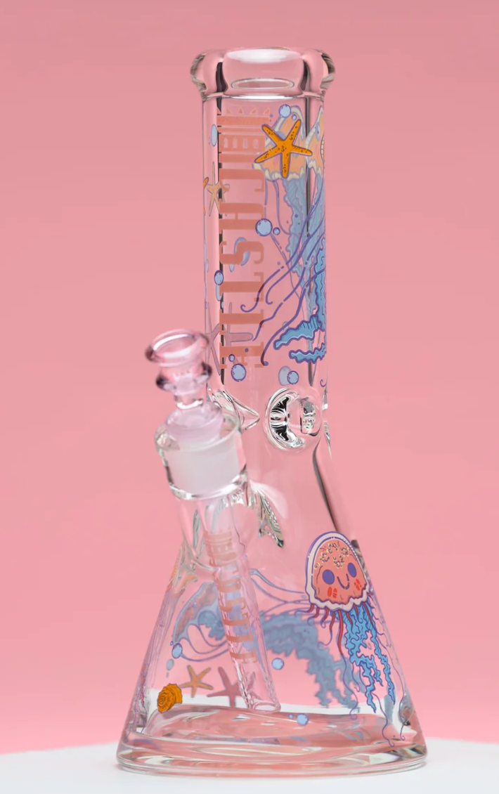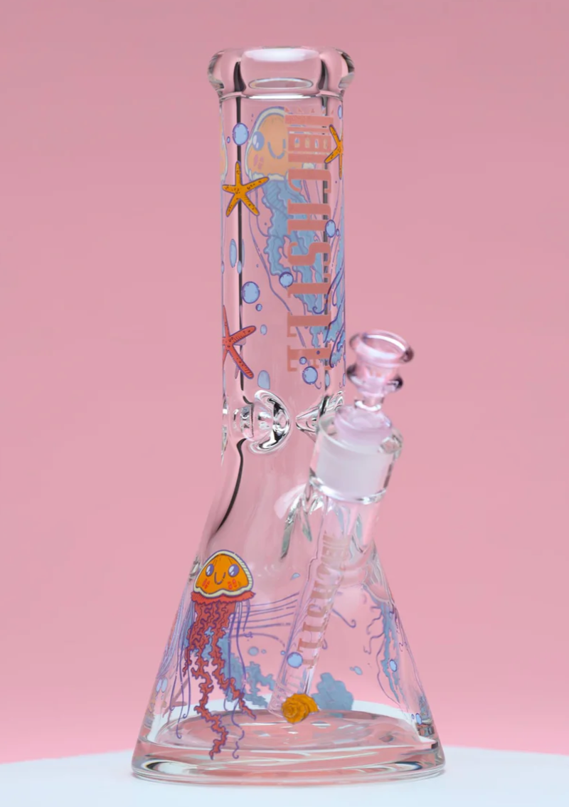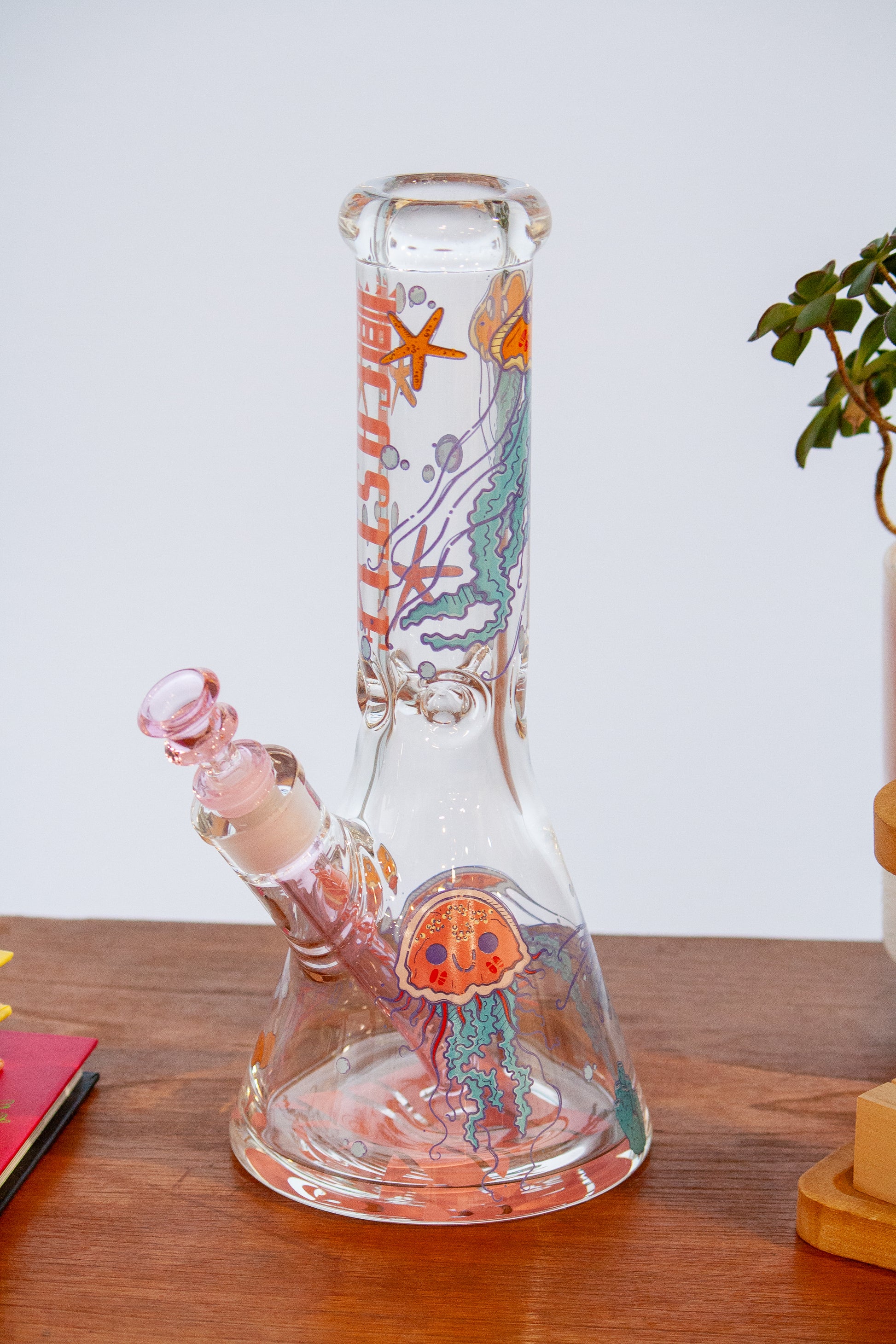 Take your sessions under the sea with the Jellyfish Bong, a whimsical yet sophisticated piece inspired by the wonders of ocean life. This beautifully crafted glass bong features a lively underwater scene with adorable jellyfish, colorful starfish, and delicate coral designs wrapping around the base. The vibrant, playful art brings a splash of oceanic charm, perfect for those who love the calming essence of the sea.
