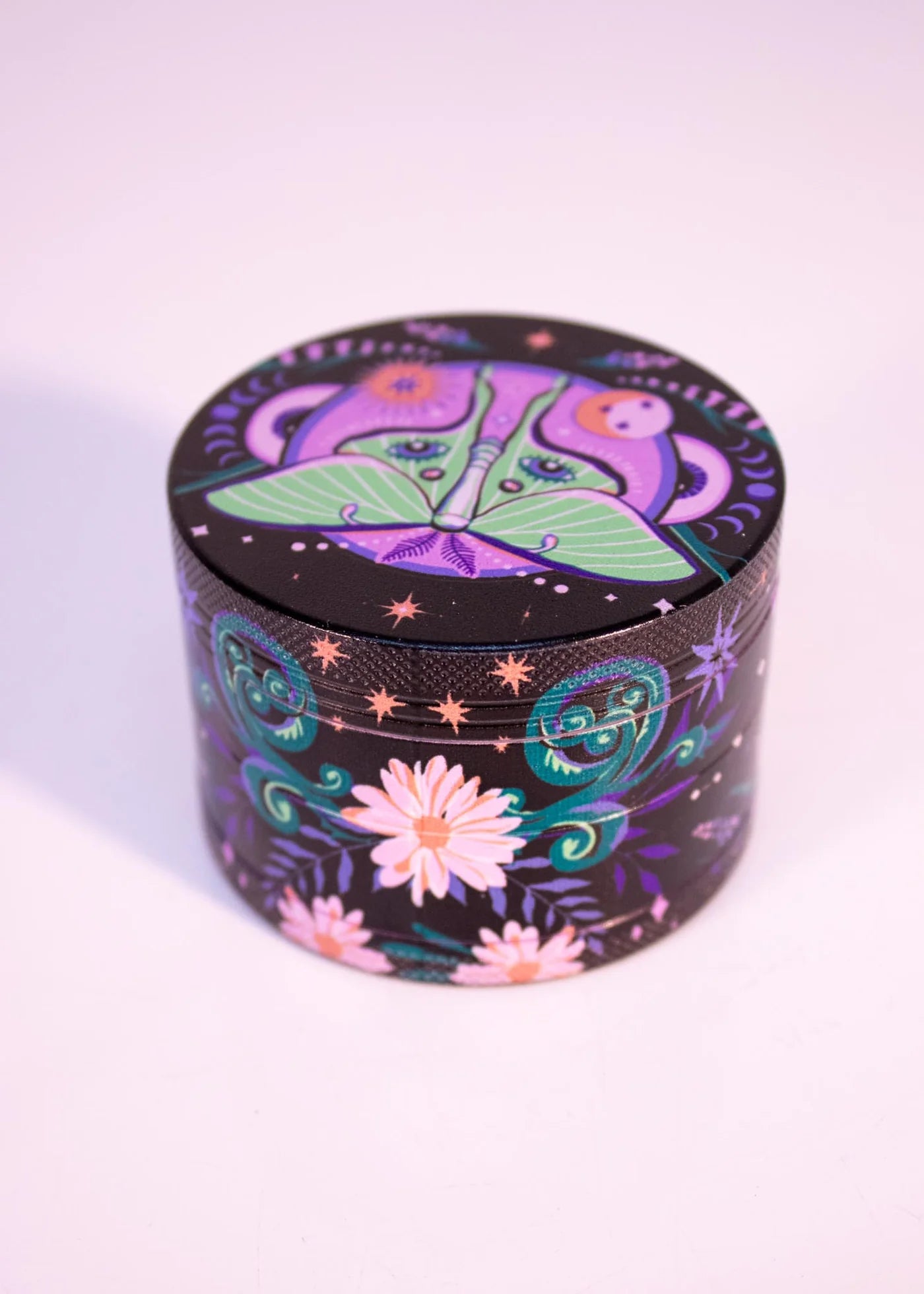 - This grinder features a beautiful Luna Moth surrounded by floral and celestial elements