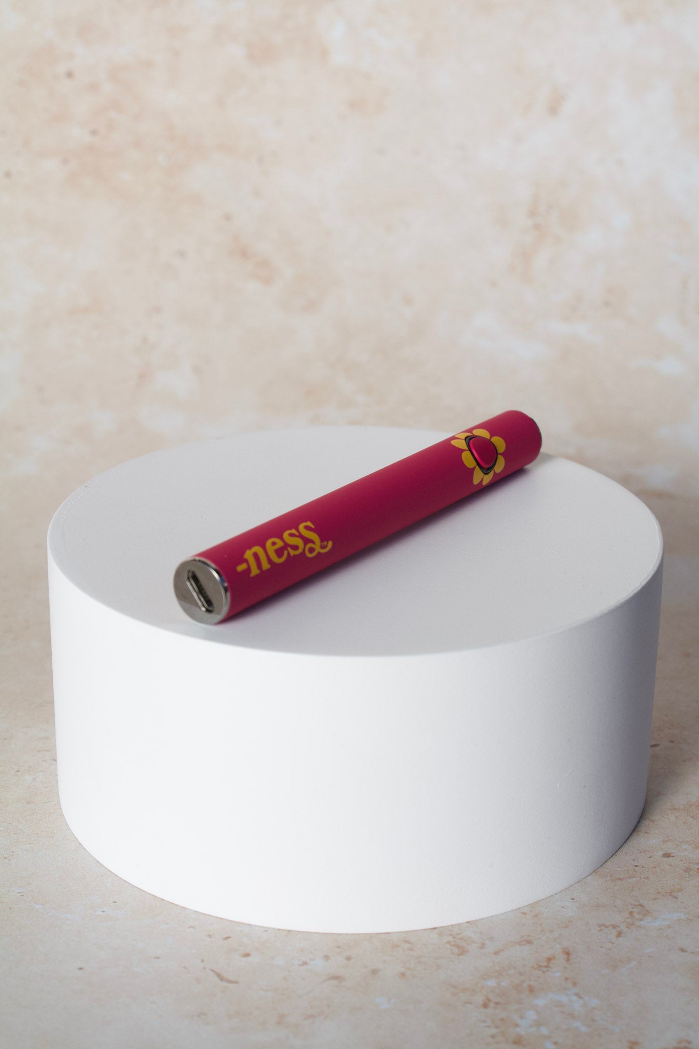 Rechargeable, safety-certified vape battery with push-button activation, three power settings and micro-USB charging port.