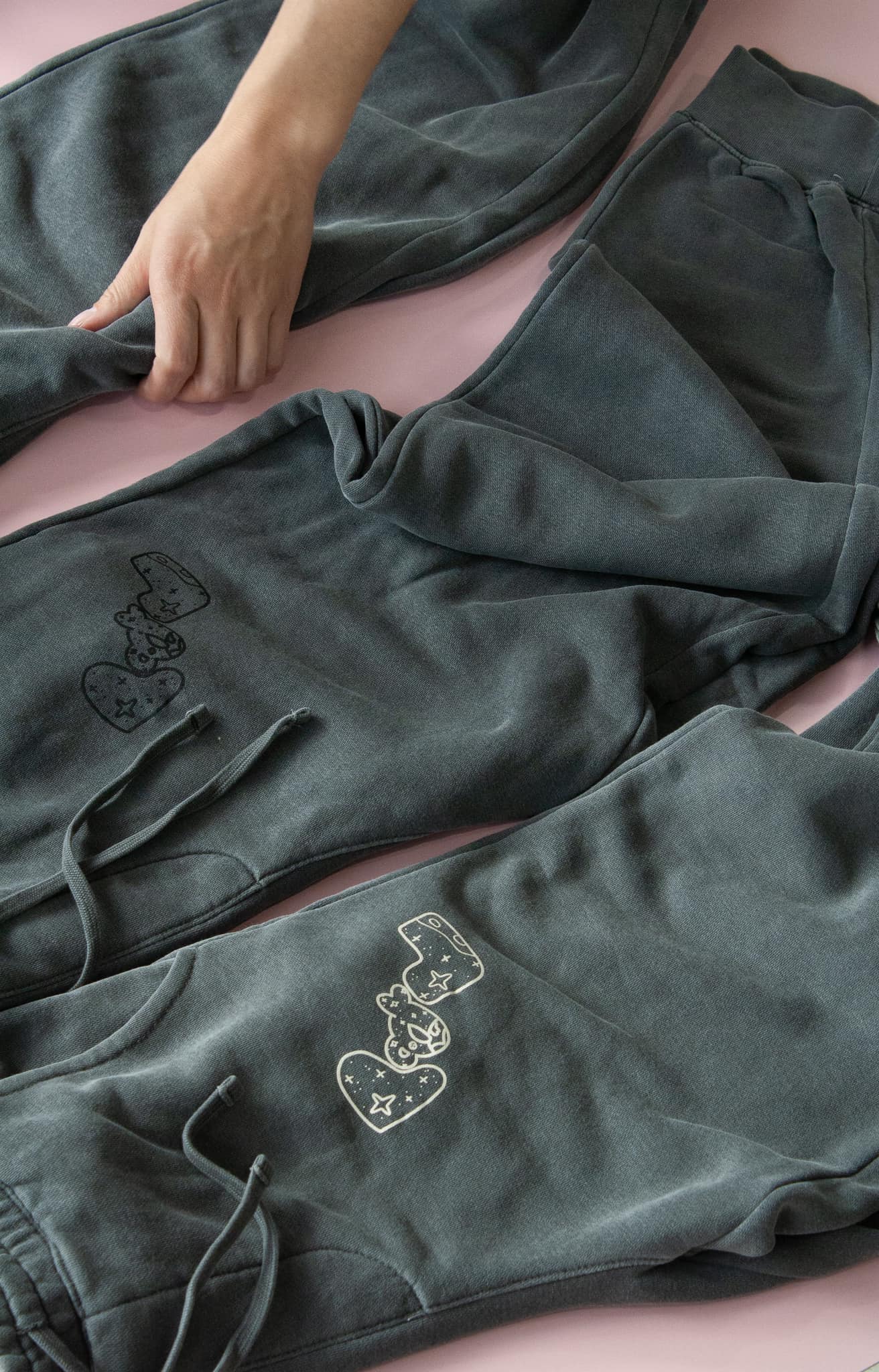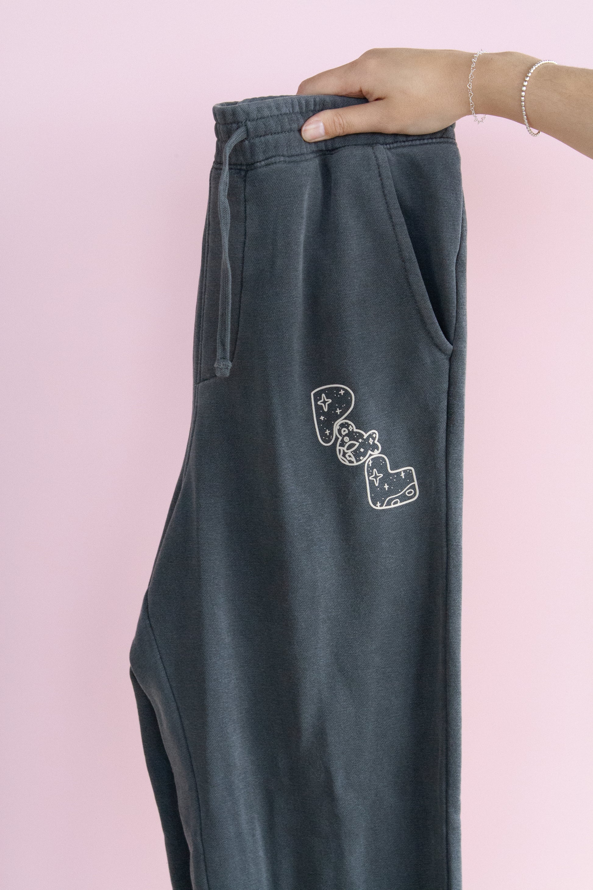 Dark grey, unisex fit sweat pants, high waisted. Screen printed P+L space-themed decal in cream coloured ink, designed by Rompotodo.